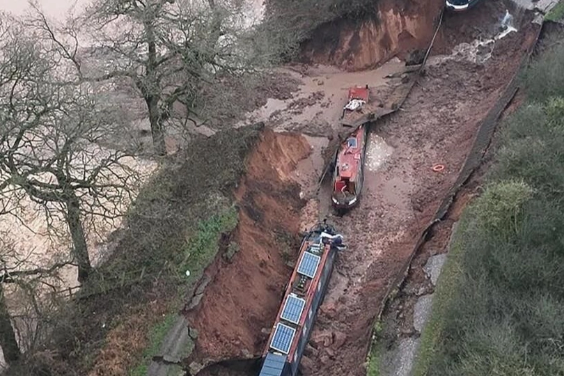 West Midlands bölgesindeki Shropshire Kanalı’nda meydana gelen set çökmesi, bölgede büyük bir obruğun oluşmasına neden oldu.