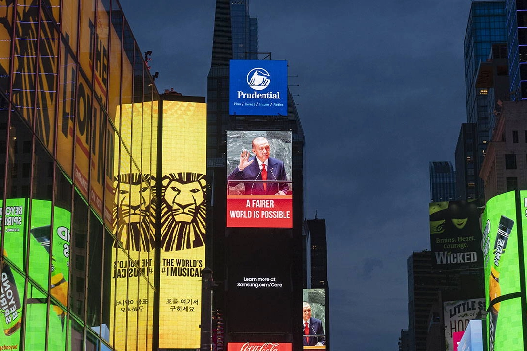 Birleşmiş Milletler’in 80. Genel Kurulu için dünyanın gözü New York’a çevrilmişken, Times Meydanı bu kez siyasetin vitrinine dönüştü. Cumhurbaşkanı Recep Tayyip Erdoğan’ın Genel Kurul konuşmasının ardından İletişim Başkanlığı’nın devreye girmesiyle meydandaki LED ekranlarda çarpıcı ifadeler yer aldı.