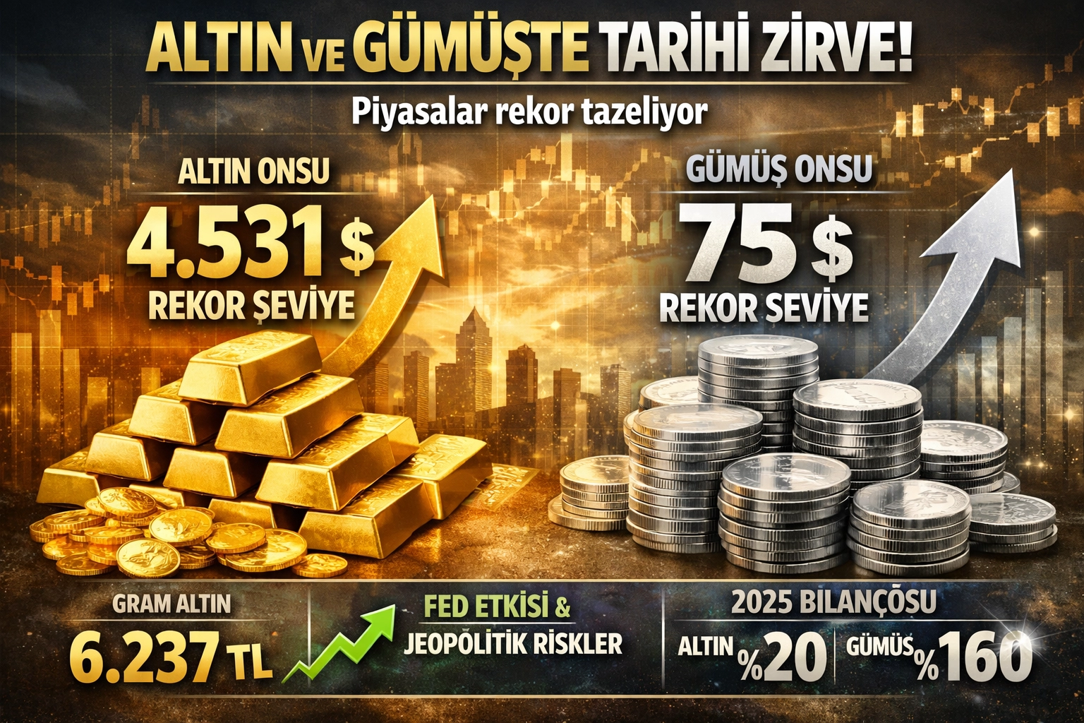Altının ons fiyatı, ABD Merkez Bankası’nın (Fed) 2026’ya doğru gevşeme patikasına gireceği yönündeki beklentilerden güçlü destek buldu. Buna ek olarak küresel ölçekte artabileceği öngörülen jeopolitik tansiyon ve merkez bankalarının sürdürdüğü altın alımları, yatırımcıların güvenli liman talebini artırdı. Bu gelişmelerle birlikte altının onsu 4.531,1 dolar seviyesine çıkarak rekor kırdı.