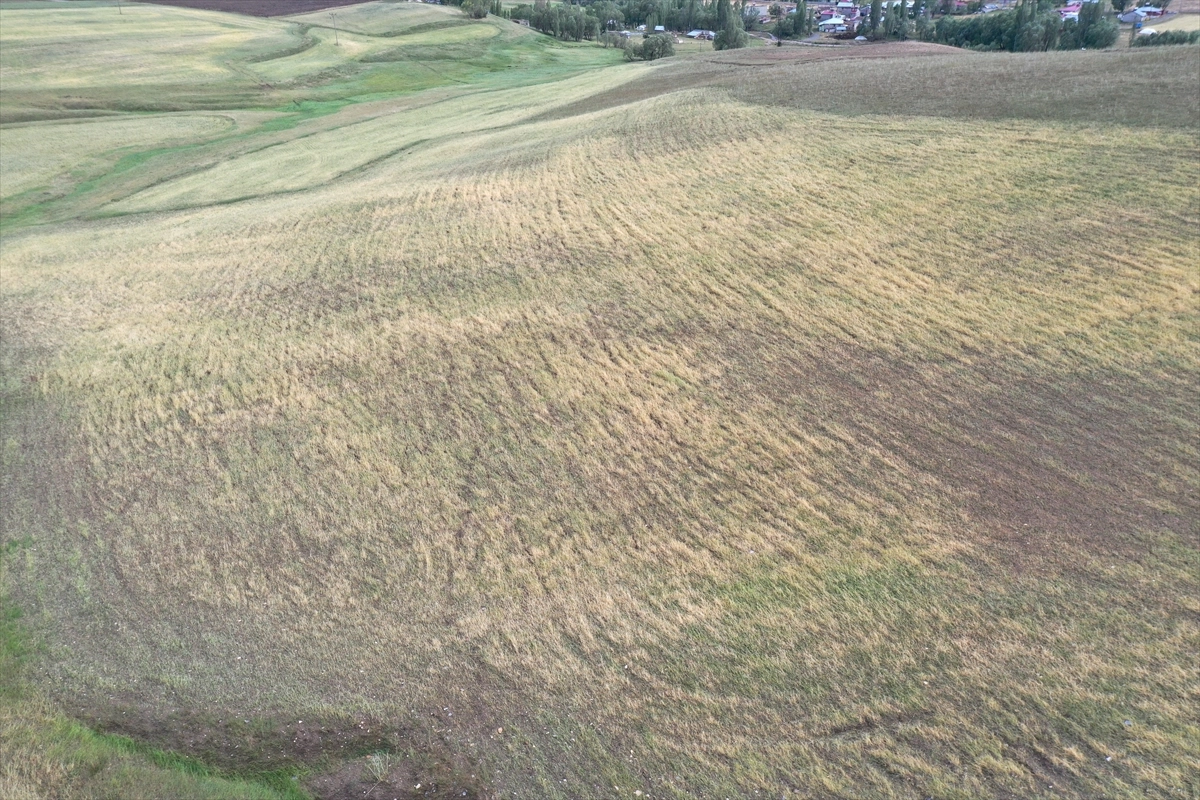 Dolunun zarar verdiği Aşağı Saklıca köyündeki arpa ve buğday tarlaları dronla görüntülendi.