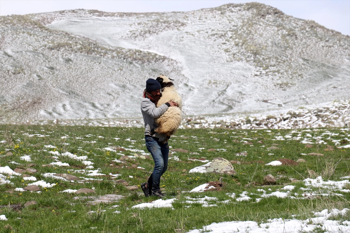 AĞRI (AA) - Havaların ısınmaya başlamasıyla bir süre önce yola koyulan göçerler, küçükbaş hayvan sürüleriyle Ağrı'nın Taşlıçay ilçesinde bulunan yüksek rakımlı Sinek Yaylası'nda kar yağışına yakalandı.