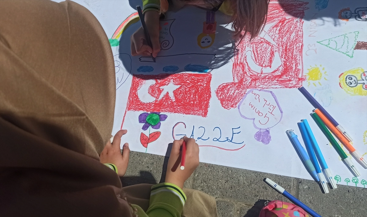Çizdikleri resimlerin üzerine "Dünya çocuklar günü kutlu olsun", "Gazzeli çocukları rahat bırakın" ve "Gazze'yi seviyoruz" yazıları yazan öğrenciler, saldırılan bir an önce son bulmasını istedi.