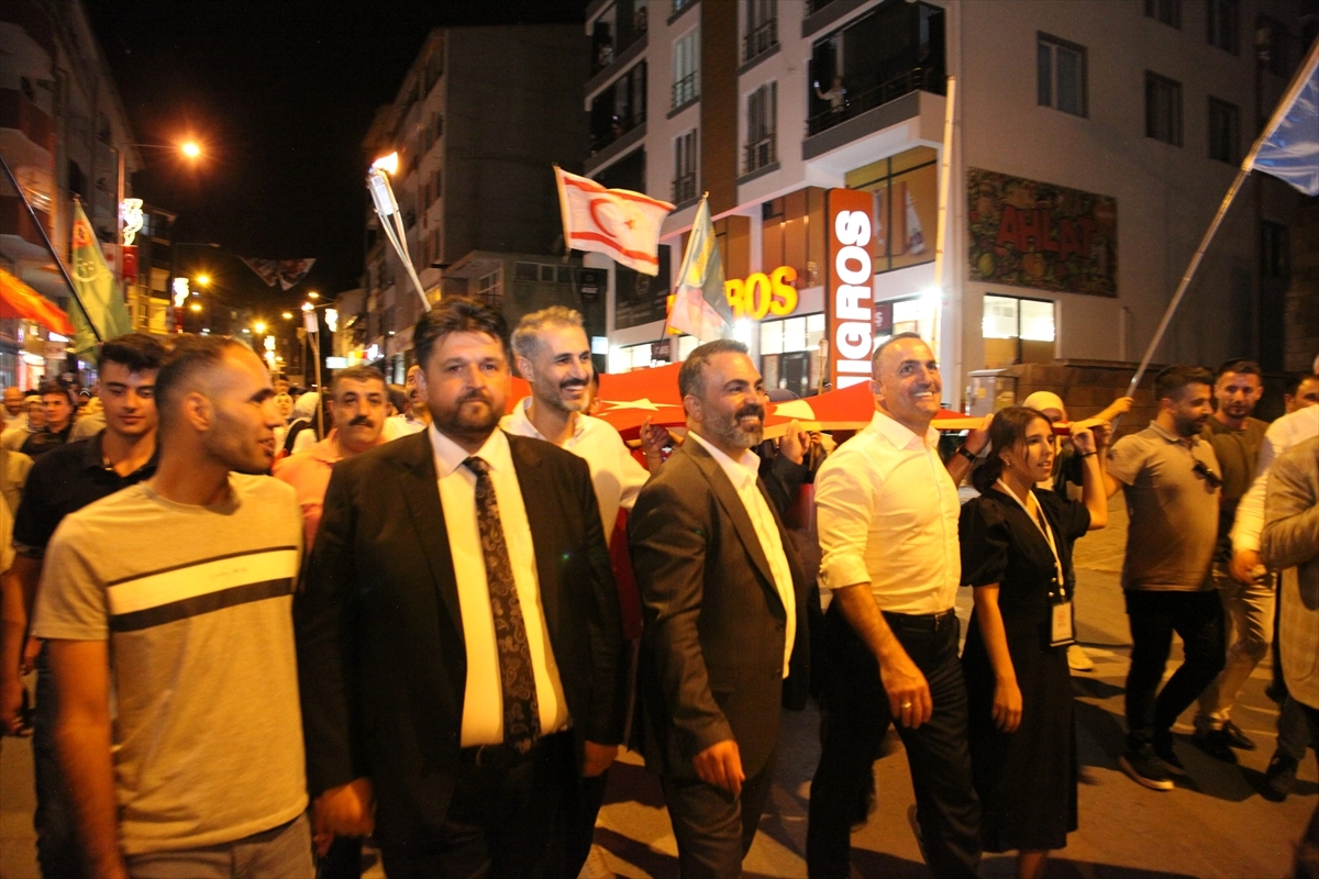 BİTLİS (AA) - Bitlis'in Ahlat ilçesinde Malazgirt Zaferi'nin 953. yıl dönümü etkinlikleri kapsamında 150 metre uzunluğundaki Türk bayrağı ve meşalelerle fener alayı düzenlendi.