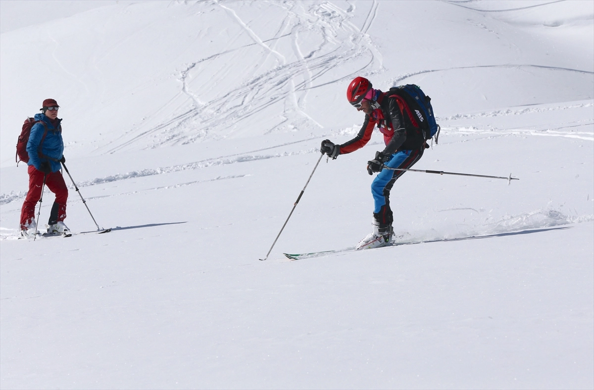 HAKKARİ (AA) - SAYİM HARMANCI - Almanya ve Avusturya'dan gelen 12 kişi, Hakkari'de yer yer 3 metre kar kalınlığı bulunan zirve ve yamaçlarda dağ kayağı yaptı.