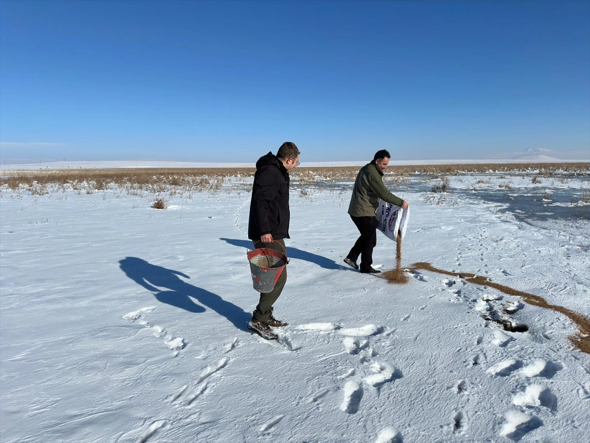 Ekipler göle gelen kuşların beslenmesi için bölgeye yem bıraktı.