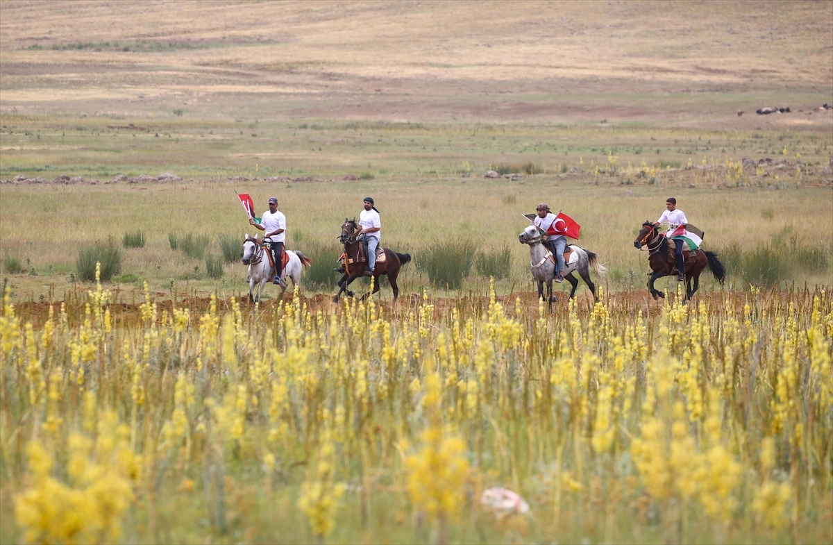 BİNGÖL (AA) - RIDVAN KORKULUTAŞ/RÜŞTÜ NESİP ÇİFTÇİ - Bingöl'ün Solhan ilçesindeki Şerafettin Yaylası'nda geleneksel at yarışlarına hazırlanan atlı spor kulübü üyeleri, İsrail'in Gazze'ye saldırılarını Filistin bayrağı açarak protesto ediyor.