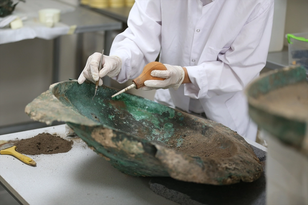 VAN (AA) - MESUT VAROL - Kültür ve Turizm Bakanlığının izniyle 37 yıldır kazı çalışmalarının yürütüldüğü Ayanis Kalesi'nde bu sene ortaya çıkarılan ve Urartuların "baştanrısı" Haldi'ye ithaf edilen 3 bronz kalkan ve 1 bronz miğferin temizliği yapılıyor.