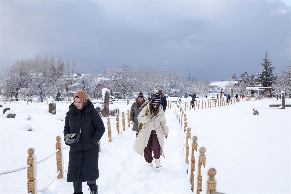 BİTLİS (AA) - Bitlis'in Ahlat ilçesinde son günlerde etkili olan kar yağışıyla beyaza bürünen Selçuklu Meydan Mezarlığı'nda ziyaretçi yoğunluğu yaşanıyor.