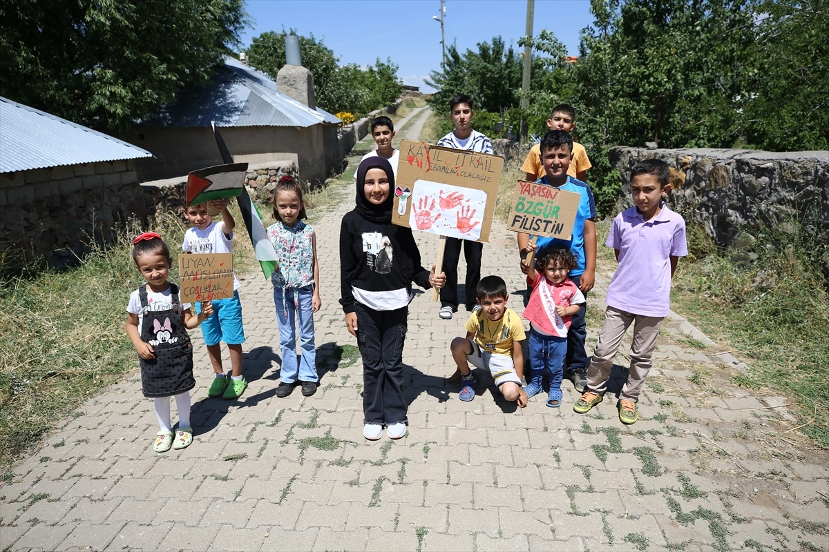 Çocukların, ellerinde Türk ve Filistin bayrakları ile kartondan hazırladıkları dövizlerle köyde gerçekleştirdikleri yürüyüş sosyal medyada yer aldı.