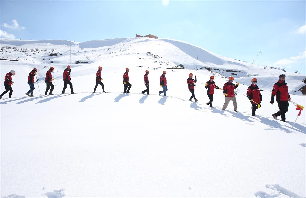 İHH arama kurtarma eğitmeni Abidin Araboğa'nın verdiği eğitime katılan gönüllüler, karla kaplı arazide çığ afetlerine hazır olmak için çaba gösteriyor.