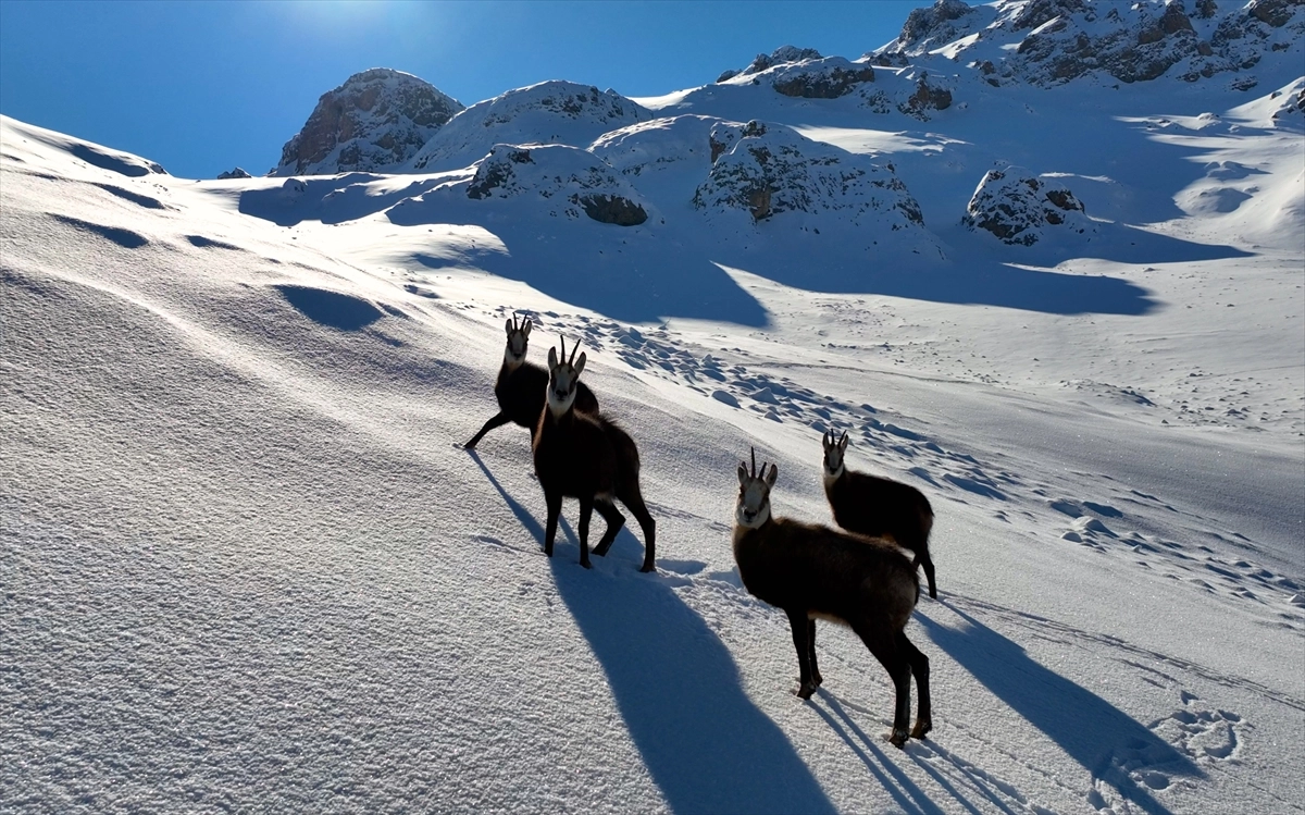 ERZİNCAN (AA) - Nesli tükenmekte olduğu için koruma altında bulunan çengel boynuzlu dağ ve yaban keçileri, Erzincan'da karlı Munzur Dağları'nda sürüler halinde görüntülendi.