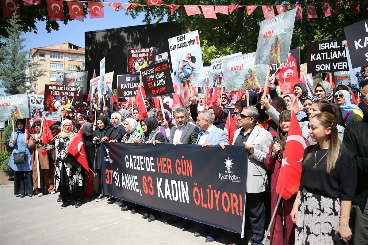 Milli İrade Meydanı'nda bir araya gelen partililer, "Anne katili İsrail", "Çocuk katili İsrail", "Daha kaç annenin yüreği yanacak?" yazılı pankartlar taşıyarak sloganlar attı.