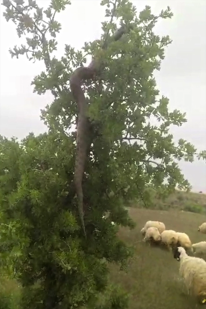 Beyelması köyü mevkisinde koyun otlatan besici Gökhan Elitaş, yaklaşık 2,5 metre uzunluğundaki bir yılanın alıç ağacında olduğunu gördü.