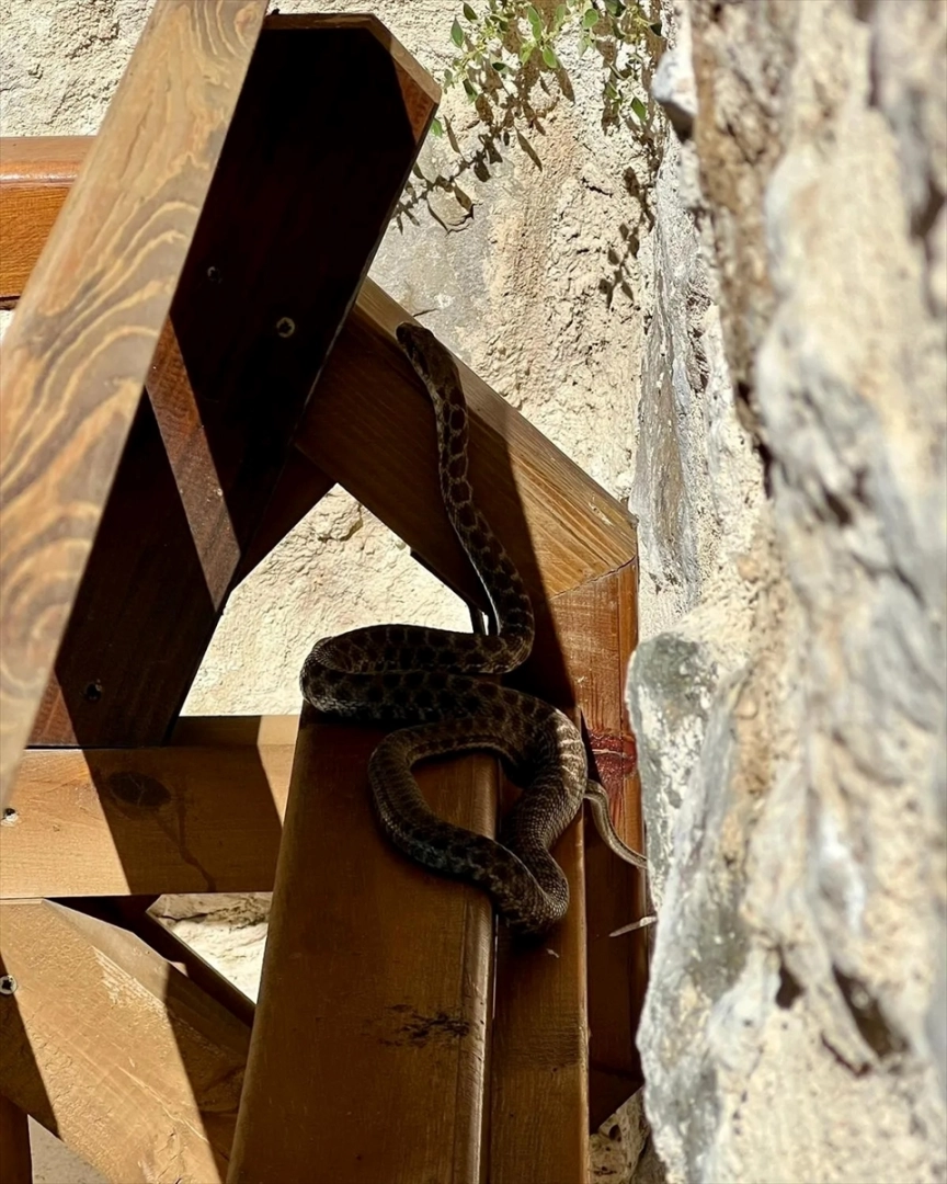 Olay yerine sevk edilen itfaiye ekipleri, avluda bir bankın üzerinde duran yılanı özel aparatla yakaladı.
