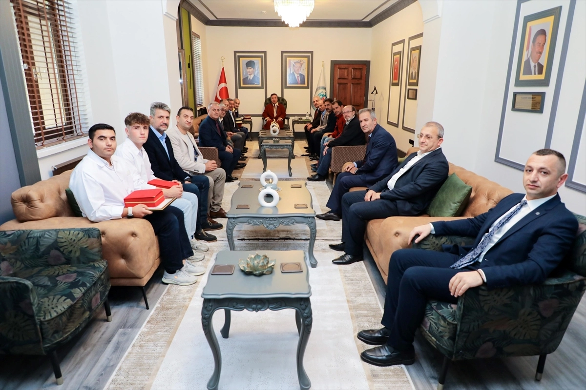 Valilikten yapılan açıklamaya göre, Ticaret İl Müdürü Recai Palabıyık, Esnaf ve Sanatkarlar Odaları Birliği Başkanı Bedir Limon, oda başkanları ile Mesleki Eğitim Merkezi Müdürü Bahadır Sazlı ve beraberindekiler, Ahilik Haftası dolayısıyla Vali Hamza Aydoğdu’yu makamında ziyaret etti.