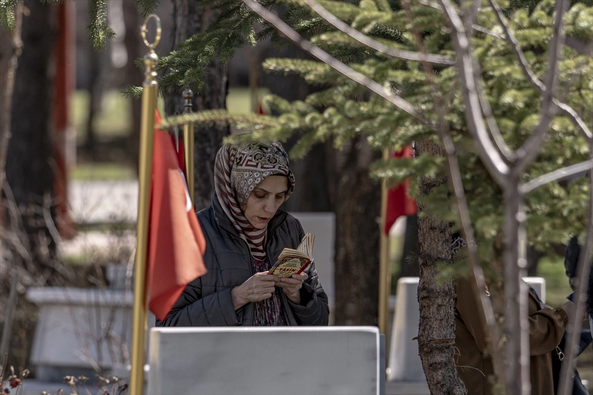 Erzurum'da Kars Kapı Şehitliği'ne gelen şehit yakınları, kabirlerin başında Kur'an-ı Kerim okuyup, dua etti.