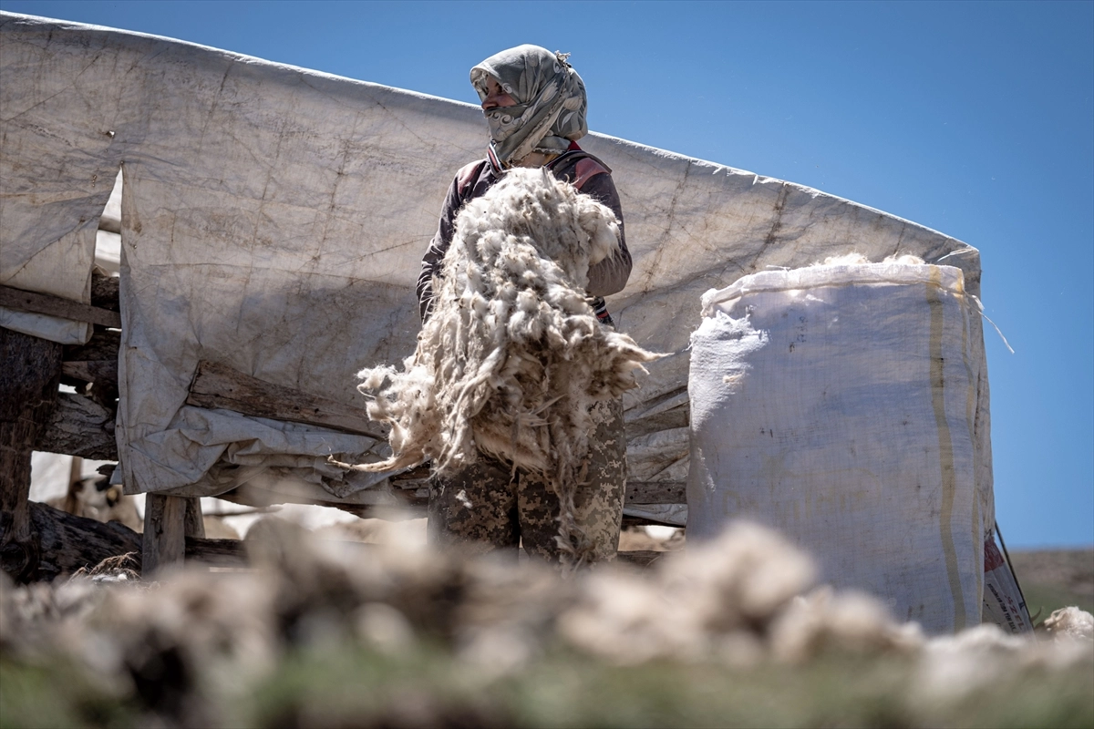 Yaz sıcaklarında hayvanlarının rahat etmesi ve süt veriminin artması için koyun kırkmaya başlayan göçerler, meşakkatli işlerini kolaylaştırmak için el birliği yapıyor.