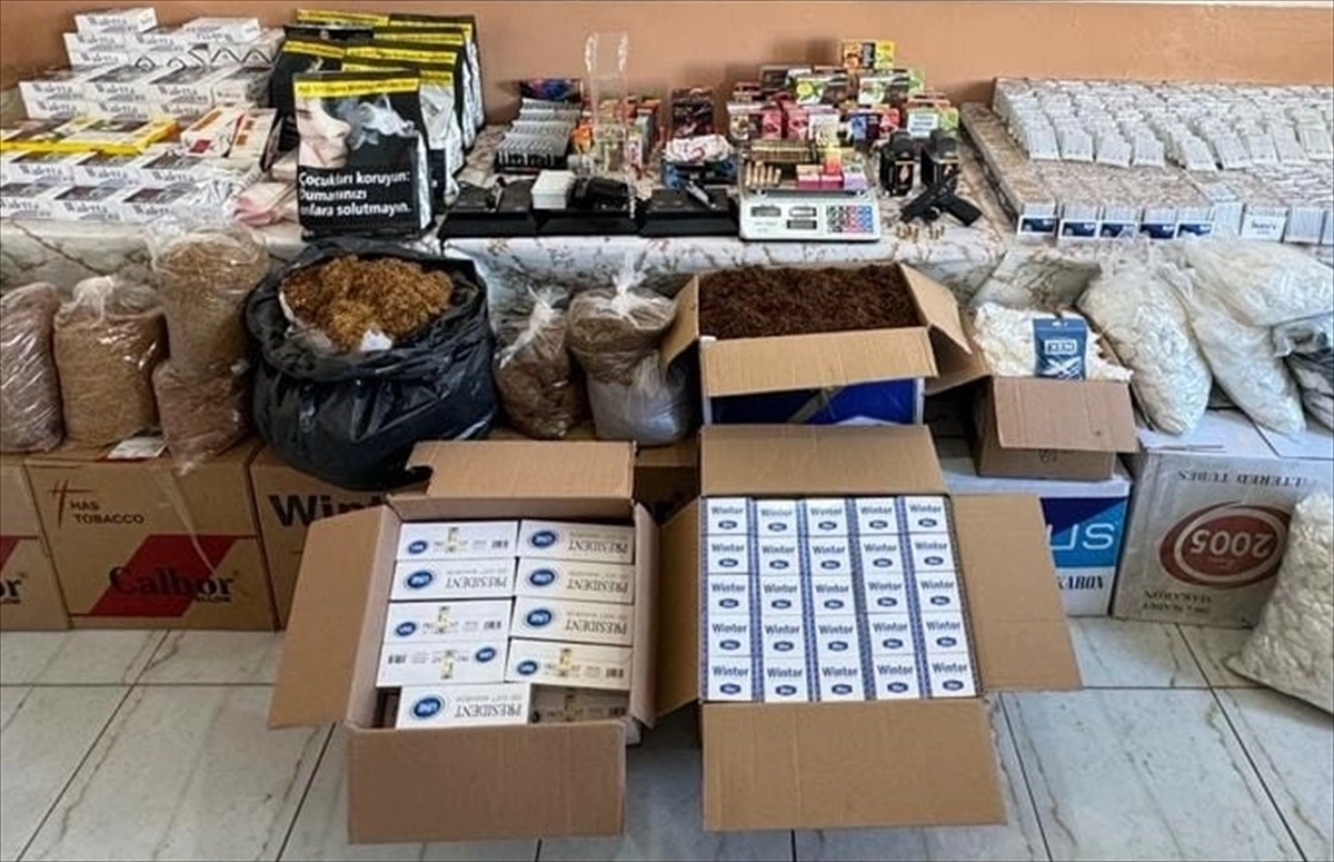 Yapılan aramalarda ruhsatsız tabanca, elektronik sigara dolum makinası, terazi, 2 manuel yaylı sistem sigara dolum makinası, 50 küçük sigara doldurma aparatı, 100 bin dolu makaron, 250 bin boş makaron, 50 kilogram nargile tütünü, 500 likit filtre, 150 kilogram kıyılmış tütün, 100 kesilmiş bandrol, 80 puro, 50 bin filtre ve 20 bin sigara paketlemede kullanılan poşet ele geçirildi.
