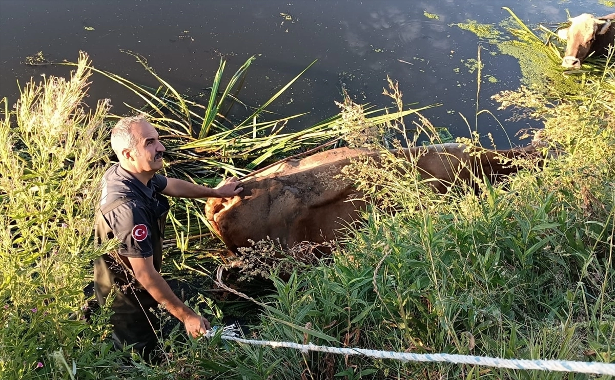 Olay yerine gelen itfaiye ekiplerince büyükbaş hayvanlar halat yardımıyla bataklıktan kurtarılarak sahibine teslim edildi.