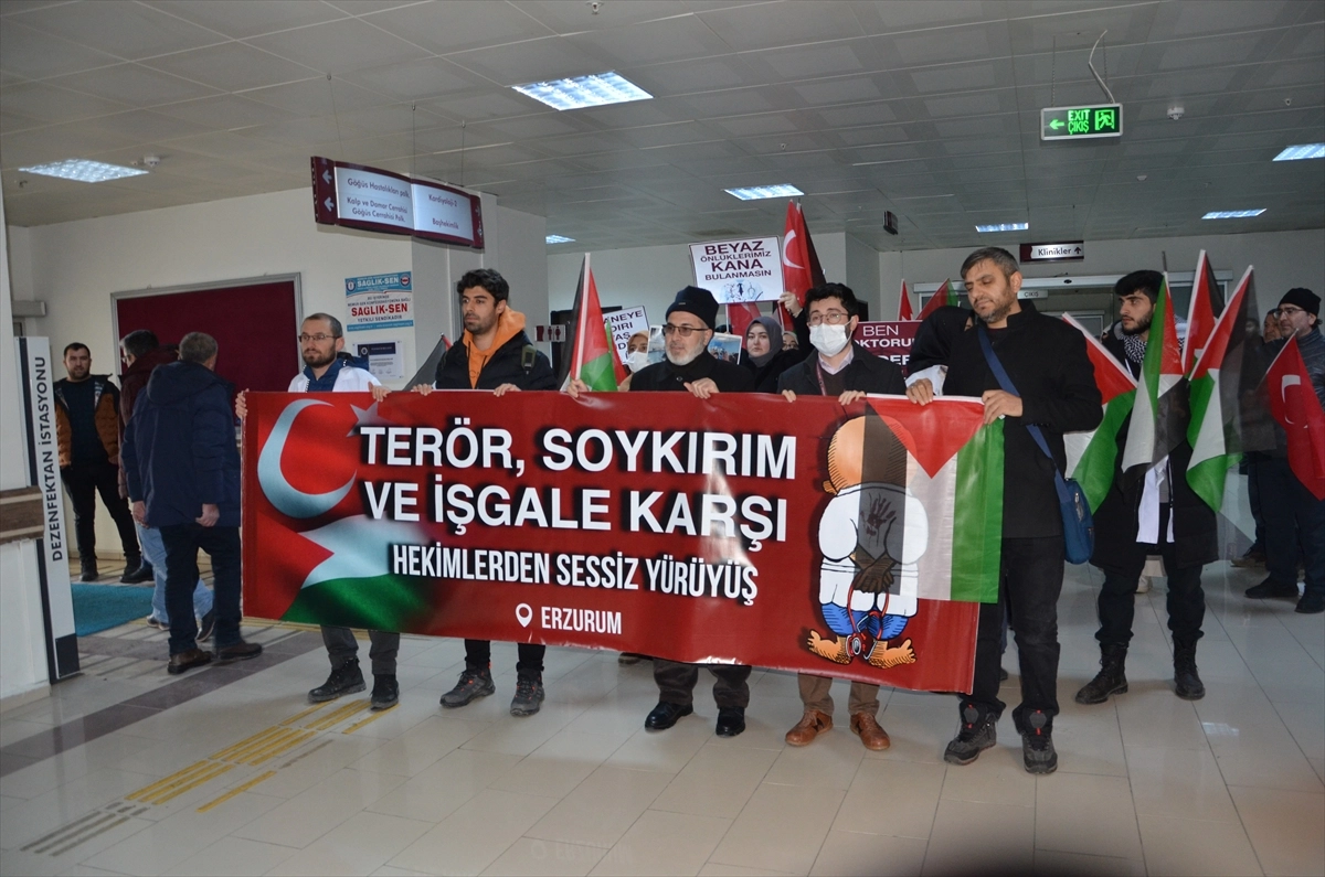 ERZURUM (AA) - Erzurum'da hekimler ve sağlık çalışanları, İsrail'in Gazze'ye yönelik saldırılarını protesto etmek Atatürk Üniversitesi Araştırma Hastanesi içinde giydikleri kanlı önlüklerle sessiz yürüyüş düzenledi.