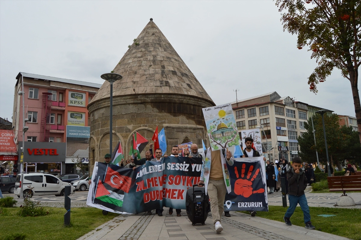 Erzurum Kalesi önünde bir araya gelen doktorlar, üniversite öğrencileri, sağlık çalışanları, bazı sivil toplum kuruluşlarının temsilcileri ve vatandaşlar, ellerinde Türkiye, Filistin ve Türkmenistan bayraklarıyla yürüdü.