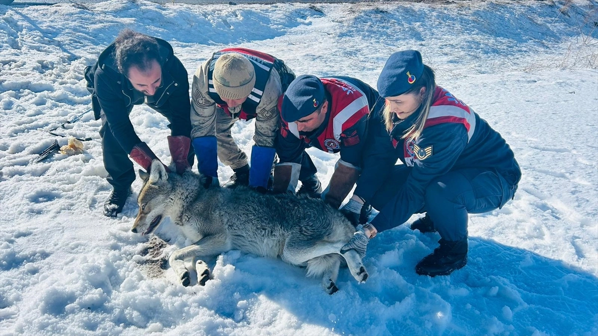 İl Jandarma Komutanlığı Çevre Doğa ve Hayvanları Koruma Timi ile İlçe Jandarma Komutanlığı ekipleri, saha çalışmalarında Ovaköy mevkisinde karla kaplı arazide yaralı ve bitkin kurt buldu.