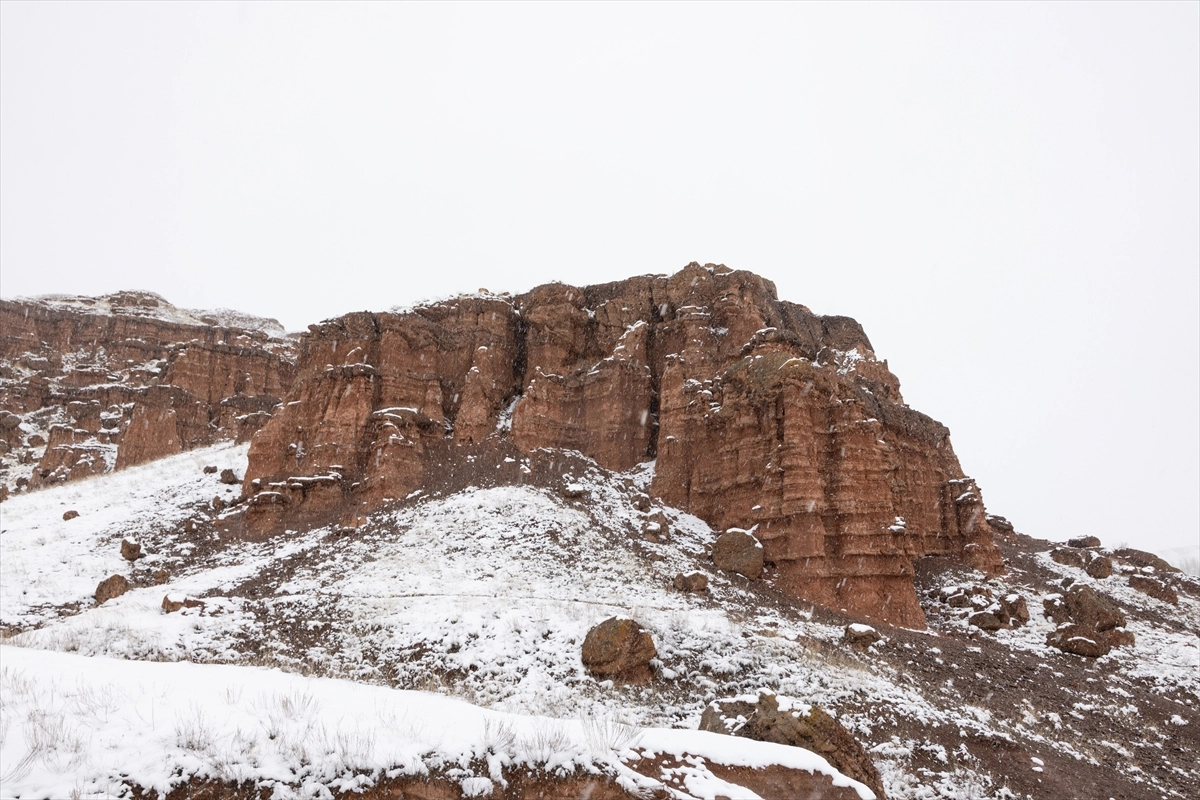 Kar yağışının ardından kırmızı-beyaz görünüme kavuşan peribacalarını her yıl binlerce yerli ve yabancı turist ziyaret ediyor.