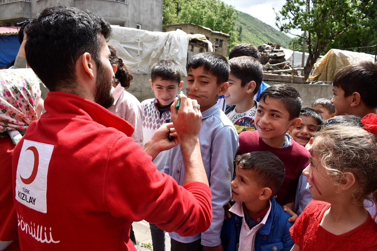 Okulun bahçesinde yüzlerini boyadıkları çocuklarla müzik eşliğinde halay çeken, oyunlar oynayan gönüllüler, farkındalık oluşturmak amacıyla Türk Kızılayın tanıtımını yaptı.