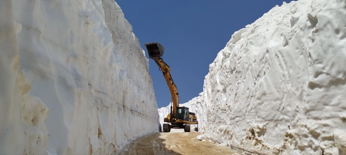 Haziran ayının son günlerinde de kar kalınlığının yer yer 8 metreyi bulduğu bölgede zor koşullarda çalışma yürüten ekipler, bazı noktalarda ekskavatör kullanarak ilerleyebiliyor.