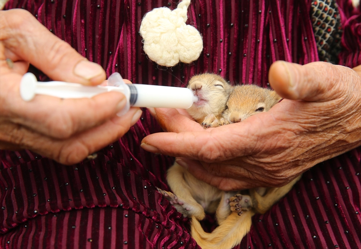 Beldenin Bağlarbaşı Mahallesi'nde yaşayan 70 yaşındaki Hemi Ayva, tarlada çalışırken 2 sincap yavrusunu bitkin halde bulunca eve götürdü. Ayva, diğer aile bireyleriyle bakımı üstlendiği hayvanlara şırıngayla süt vererek hayata tutunmalarını sağladı.