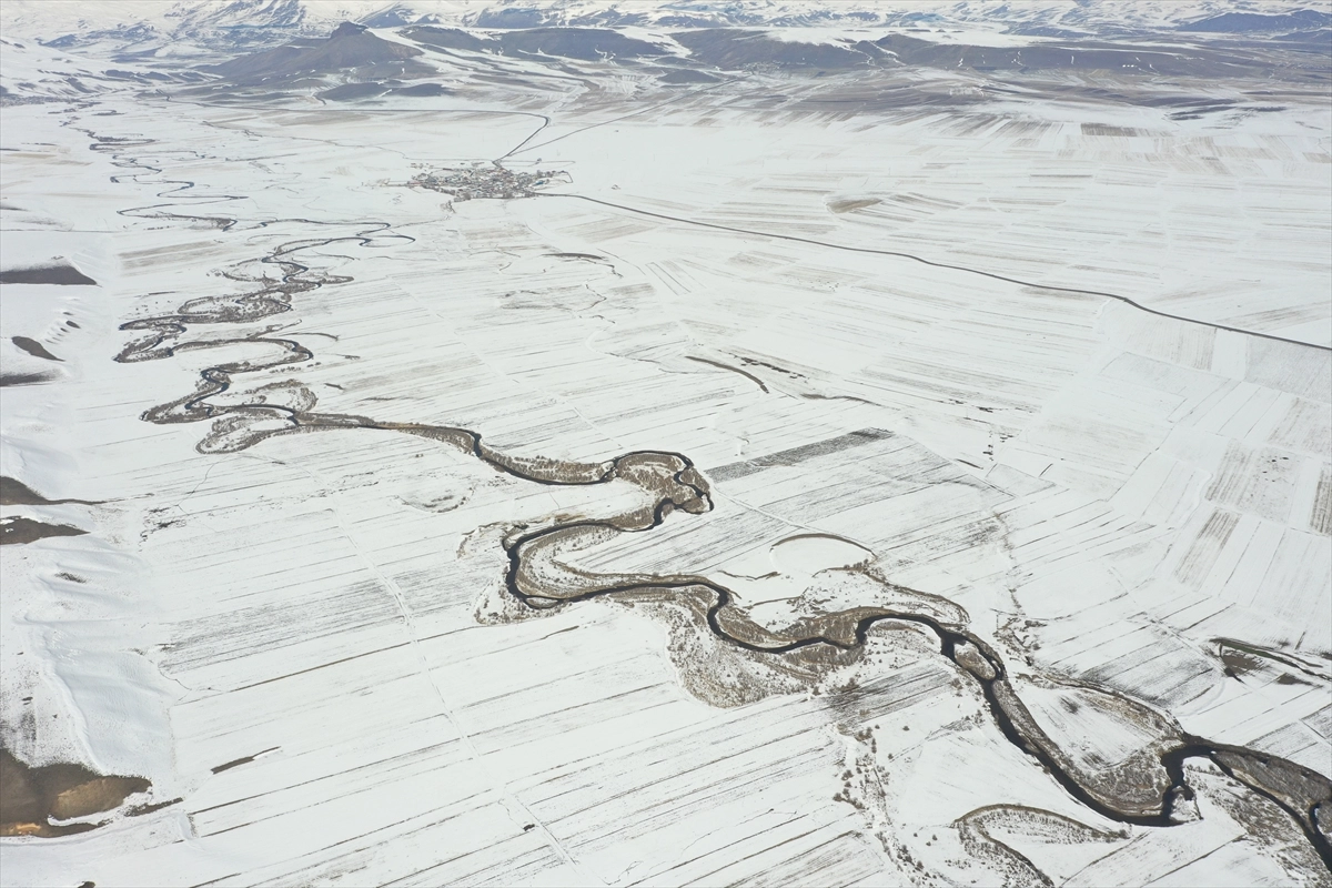 Karla kaplanan ilçedeki menderesler ve çevresi dronla görüntülendi.