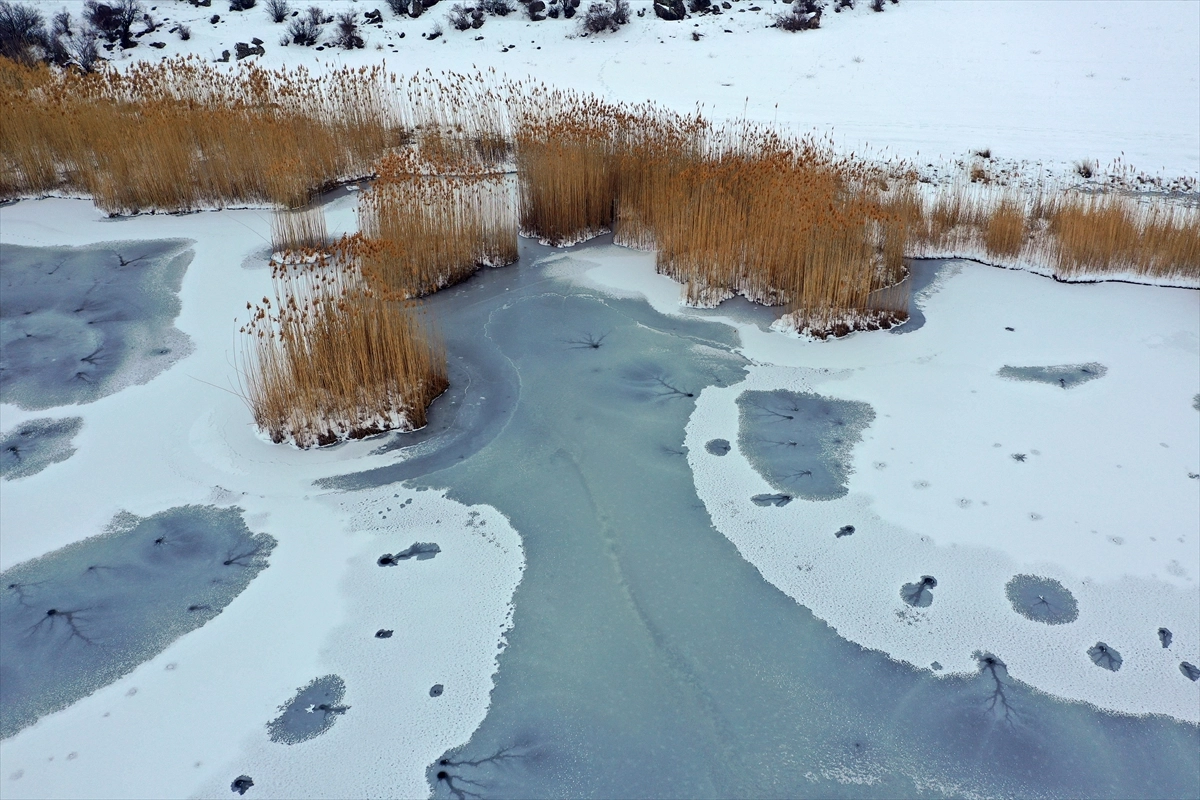 Gölün yüzeyinde oluşan buz şekilleri, Anadolu Ajansı ekibince dron ile görüntülendi.