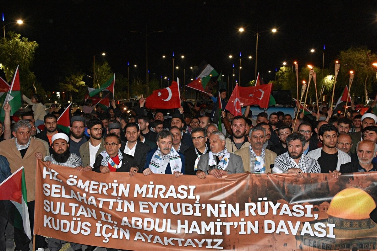 Erzurum Sivil Toplum Platformunca (ESTP) düzenlenen "Filistin için özgürlük konvoyu"na katılan vatandaşlar, kent merkezindeki Mehmet Zahit Kotku Camii'nde yatsı namazı sonrası bir araya geldi.