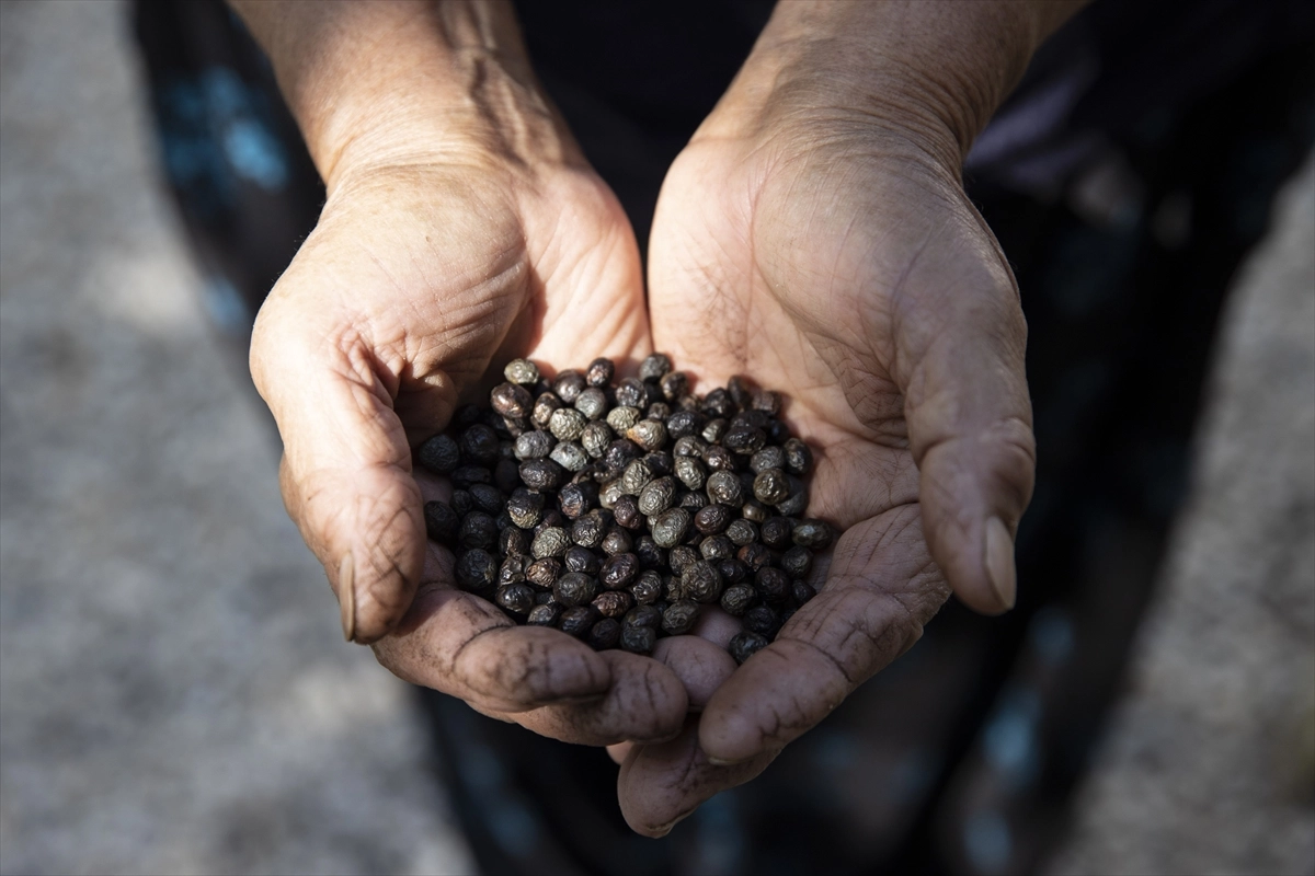 Hasat öncesi çedene ağaçlarının altına çadır seren köylüler, gerekli hazırlıkların ardından dallardaki yeşil renkli çedeneleri sırıklarla yere düşürüyor. Zorlu mesaiyle çedeneleri torbalara dolduran köylüler, daha sonra ürünleri evlerine taşıyarak bahçelerinde güneşin karşısına seriyor.