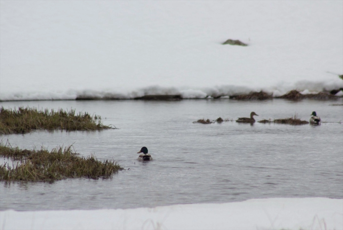 Köyde beyaza bürünen doğada akarsularda yiyecek arayan yeşilbaş ördekler de görüldü.