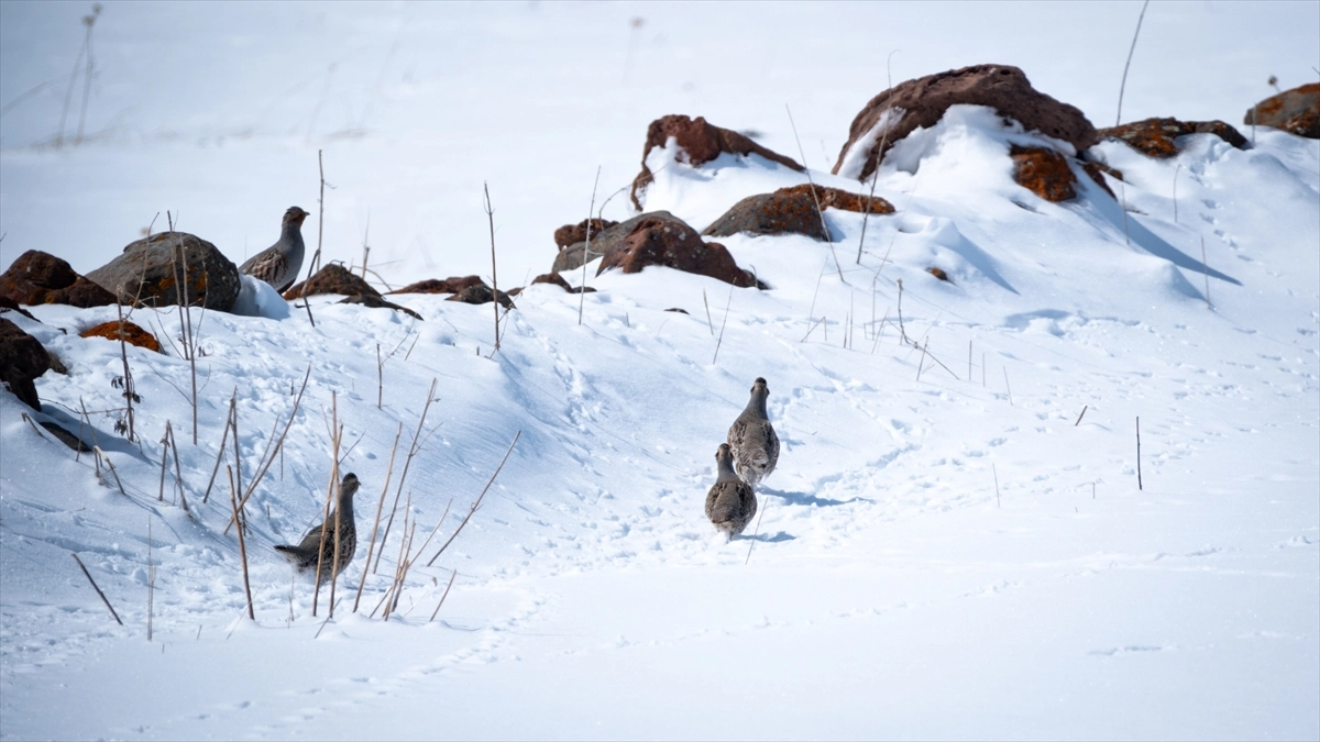 Beyaz örtüyle kaplı Borluk köyü yakınlarında yiyecek arayan çil keklikler, AA muhabirinin kadrajına yansıdı.