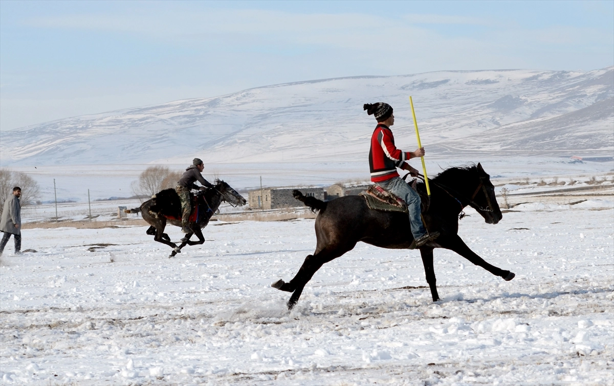 Selim ilçesinin Hasbey köyünde Hasbey Yıldızlar Atlı Spor Kulübü bünyesindeki genç sporcular, kar üstünde dostluk müsabakası yaptı.