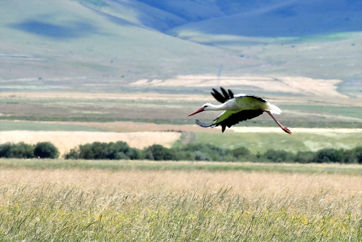 KARS (AA) - Türkiye'nin en soğuk illerinden Kars'a ilkbaharda gelen leylekler, yavrularıyla çayırlık alanda beslenirken görüntülendi.