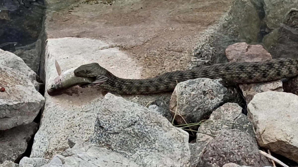 "Yılanlar baharın gelmesiyle kış uykusundan uyanır. Aç olan yılanlar uyandıklarında suya yakın bölgelere giderek balık, kurbağa gibi canlıları avlar. Keban Baraj Gölü'nde 28-30 çeşit balık türü varken halk arasında 'kral balığı' olarak bilinen balıkla beslendiğini görüyoruz. Suda yakaladığı balığa zehrini aktararak kısmi felce uğratıyor. Yılanların mide ve karın kasları çok gelişmiştir. Vücudundan daha büyük bir canlıyı rahatlıkla yutabiliyor. Zehirli yılanların kuyrukları küt, ince boyunlu ve kafa yapısı üçgen şekildedir."