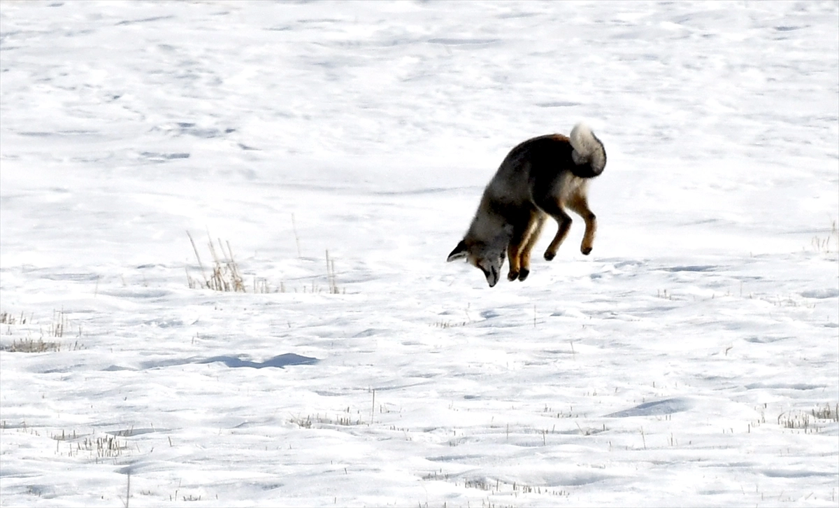 Kar altındaki farelere odaklanan kızıl tilkiler, yaklaşık 20-30 saniye hiç kıpırdamadan avının hareketini seslerle takip ediyor ve bir anda yaklaşık 1 metre zıplayarak kafasını kara gömüyor.