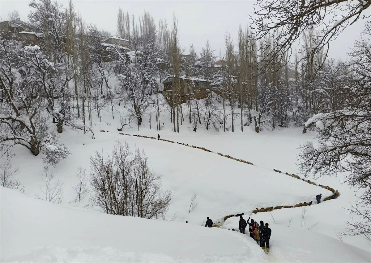 VAN (AA) - Van'ın Bahçesaray ilçesinde küçükbaş hayvan sürüsünün kar örtüsü arasındaki yolculuğu cep telefonu kamerasınca kaydedildi.