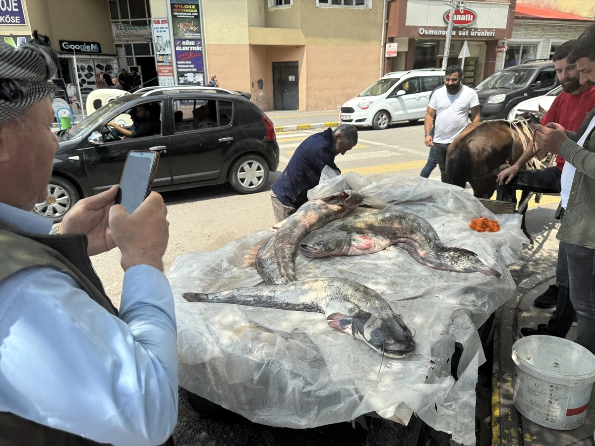 Kentteki Kura Nehri'nde balıkçılık yapan Halil Bulutlar, Sarme mevkisinde ağına takılan yayın balıklarını güçlükle kıyıya çekti.