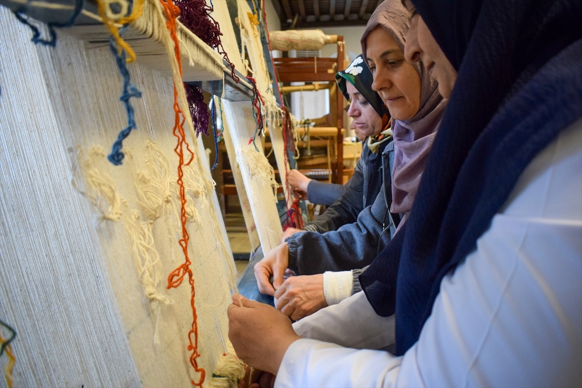 Malatya Halk Eğitim Merkezi onaylı halıcılık kursuna katılan 15 kadın, hafta içi her gün Malatya kerpiç evlerde bulunan atölyede ilmek ilmek halı dokuyor.
