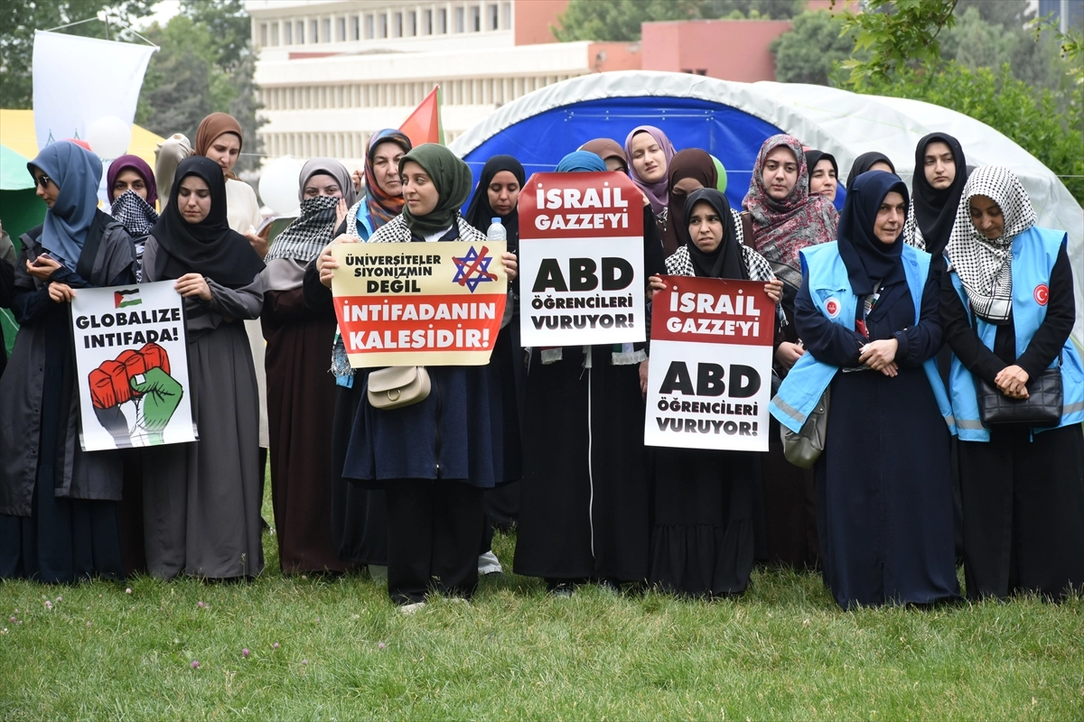 Üniversite yerleşkesinde bir araya gelen öğrenciler, İsrail'i protesto eden sloganlar attı, Filistin'e destek vermek amacıyla çadır kurdu.