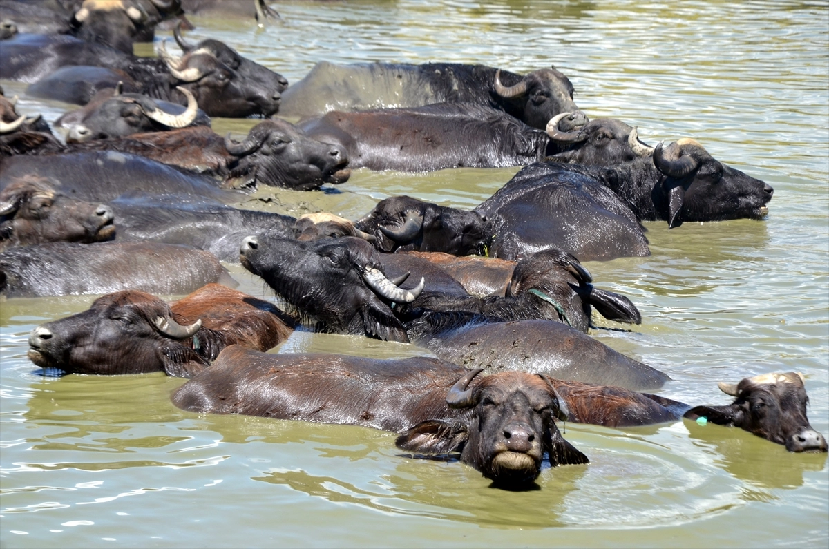 İlçeye bağlı Karakütük, Umurca ve Sarıbahçe köylerinde manda sürülerini meralarda otlatan çobanlar, sıcaklığın artığı saatlerde sürüleri Karasu Nehri, gölet ve sulama kanallarına götürüyor.