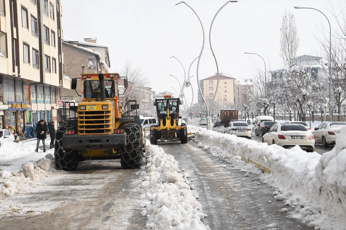 Muş Belediyesi, kentte etkili olan kar yağışının ardından cadde ve sokaklarda biriken karın temizlenmesi için 60 iş makinası ve 120 personelle çalışma yürütüyor.