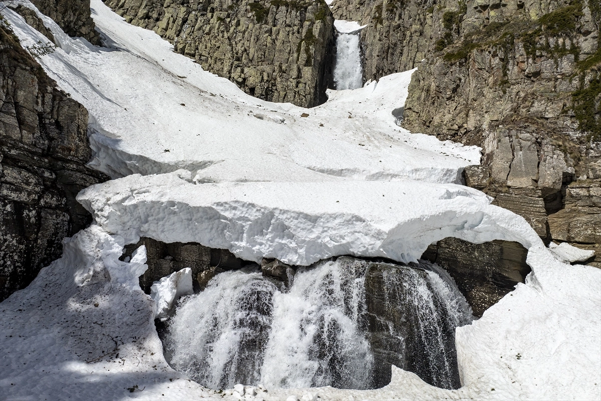 2 bin rakımda karların içinde akan şelale yerli ve yabancı turistlerin ilgisini çekiyor.