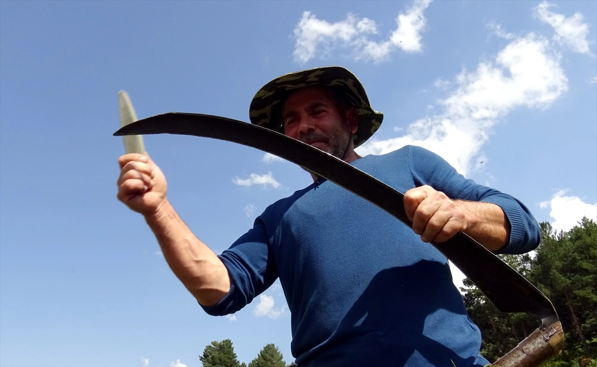 Erken saatlerde çayırlık alana gelen çiftçiler, tırpanlarının ağzını çekiçledikten sonra masatla (bilemeye yarayan alet) keskinleştiriyor.