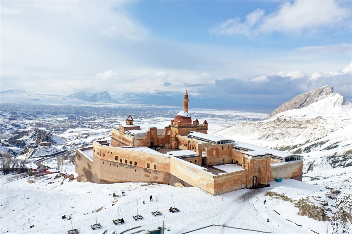 AĞRI (AA) - Ağrı'nın Doğubayazıt ilçesinde bulunan İshak Paşa Sarayı, ilkbahar mevsiminin ilk ayı olan martta yeniden karla kaplandı.