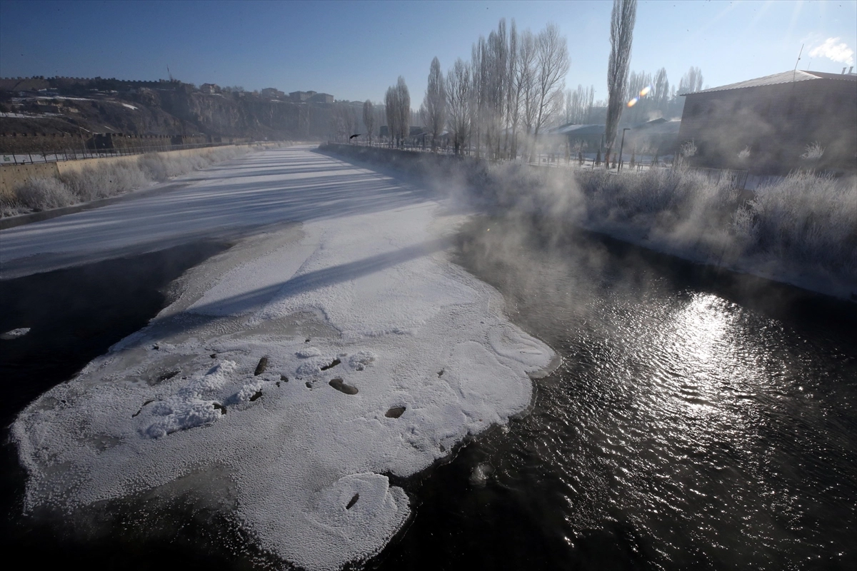 Son günlerde dondurucu soğuğun etkili olduğu kentte, Kura Nehri'nin bazı noktaları buzla kaplandı.